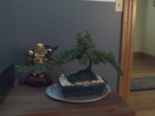 You are the coolest present I have ever received (Thanks, Mike!). When you came into the house, did you see the sign that said "Abandon all hope ye plants who enter here?" Just kidding, there is no sign. But fair warning, I should tell you that I have a reputation as an inadvertent grim reaper to plants. Just ask your predecessor, the Blue Hyacinth, once beautiful, flowering and fragrant, now reduced to a mere handful of leaves. I don't know if it was my fault that his flowers grew so tall they fell over and then died, but my sporadic-at-best watering probably didn't help. In my defense, he is still alive. Mostly. But you, dear Bonsai, are different. I promise to do better, to spray you with water everyday and do my best to keep you alive for a long, long time. Or at least to set you next to the Buddha and put him in charge of keeping you alive.